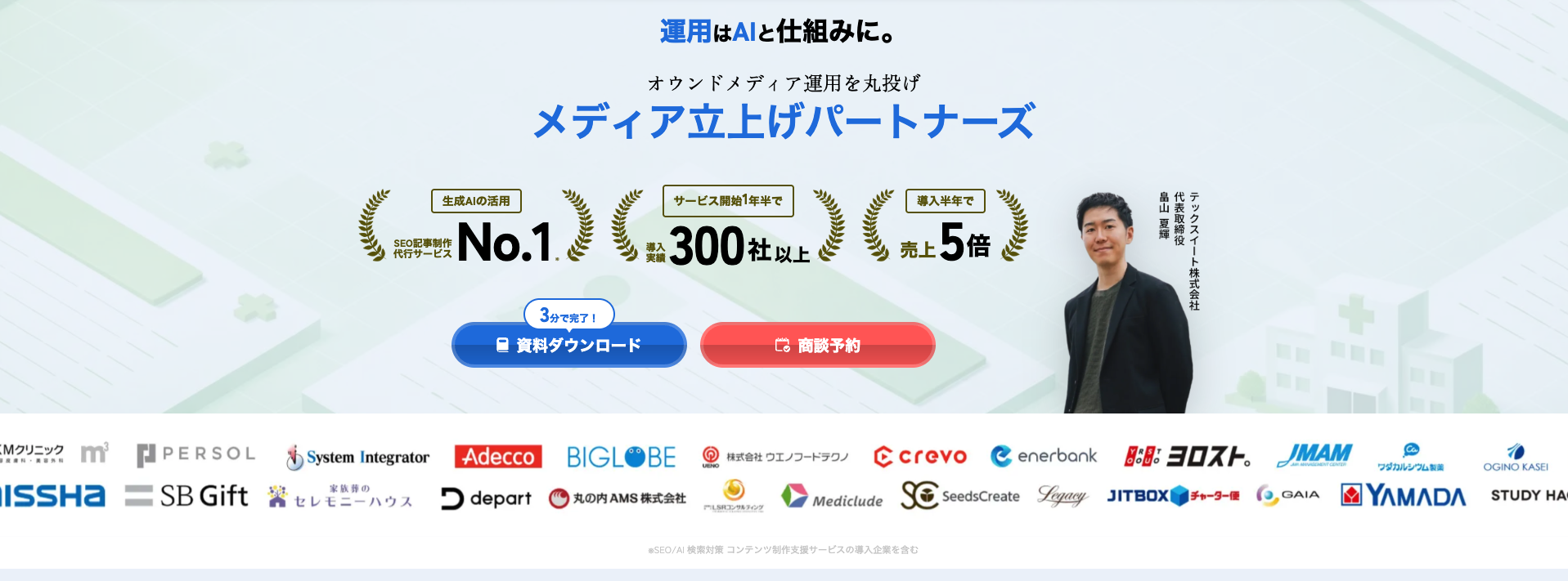 | 特徴 | 生成AIを活用したSEO記事作成代行サービス導入社数No.1のTechSuite株式会社が提供する、オウンドメディアの立上げから運用までを一気通貫で支援する伴走型サービス 戦略企画・サーバー構築・WordPress設定・コンテンツ制作・効果測定・保守まで対応。社内リソースがなくても運用できる体制を構築 生成AIと人のハイブリッド執筆により高品質な記事を制作。医師・税理士・不動産など各領域の専門家による監修オプションも利用可能 公開後もGA4・Search Consoleによる効果測定、リライト・AI検索(LLMO)対策など継続的な改善支援を実施 |
